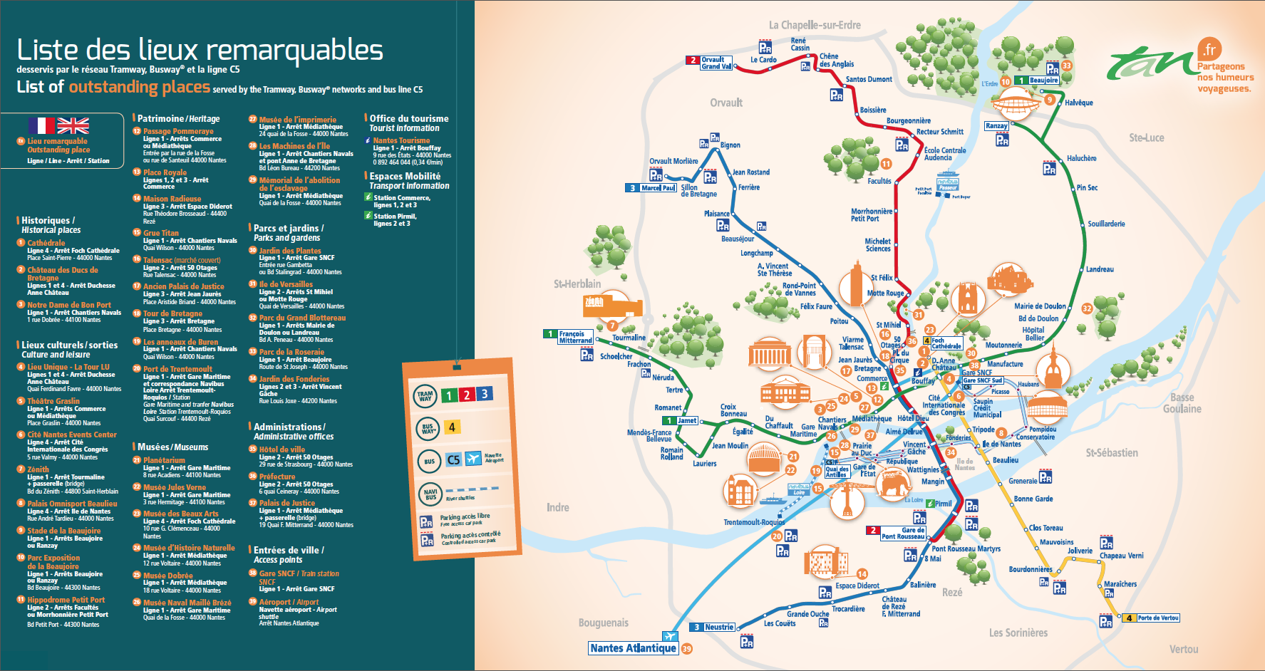 TAN is the main company responsible for the public transport network in Nantes and it's surroundings. This network includes travel by tramway and by bus. The transport services operate everyday - with the exception of the 1st of May, Christmas, and demonstration days (protests) - from 04.15am until 00.30am the next day (on Saturdays until 02.30am).